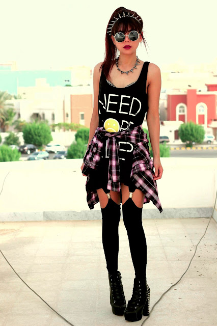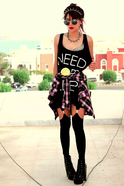 SPIKE HEADBAND, SPIKE BRA, NEED MORE SLEEP PRINT TEE , SUSPENDER LEGGINGS c/o ROMWE, RETRO ROUND SUNGLASS, STUDDED LACE UP BOOTS c/o CHOIES,